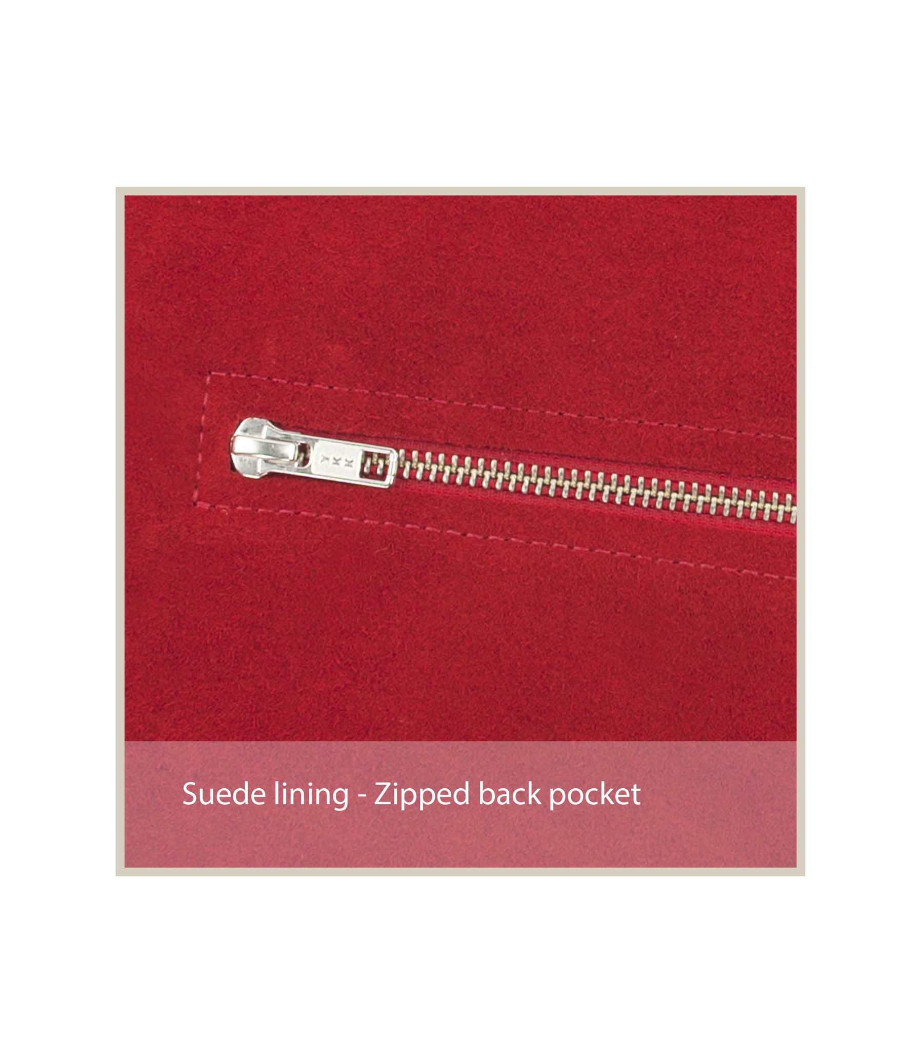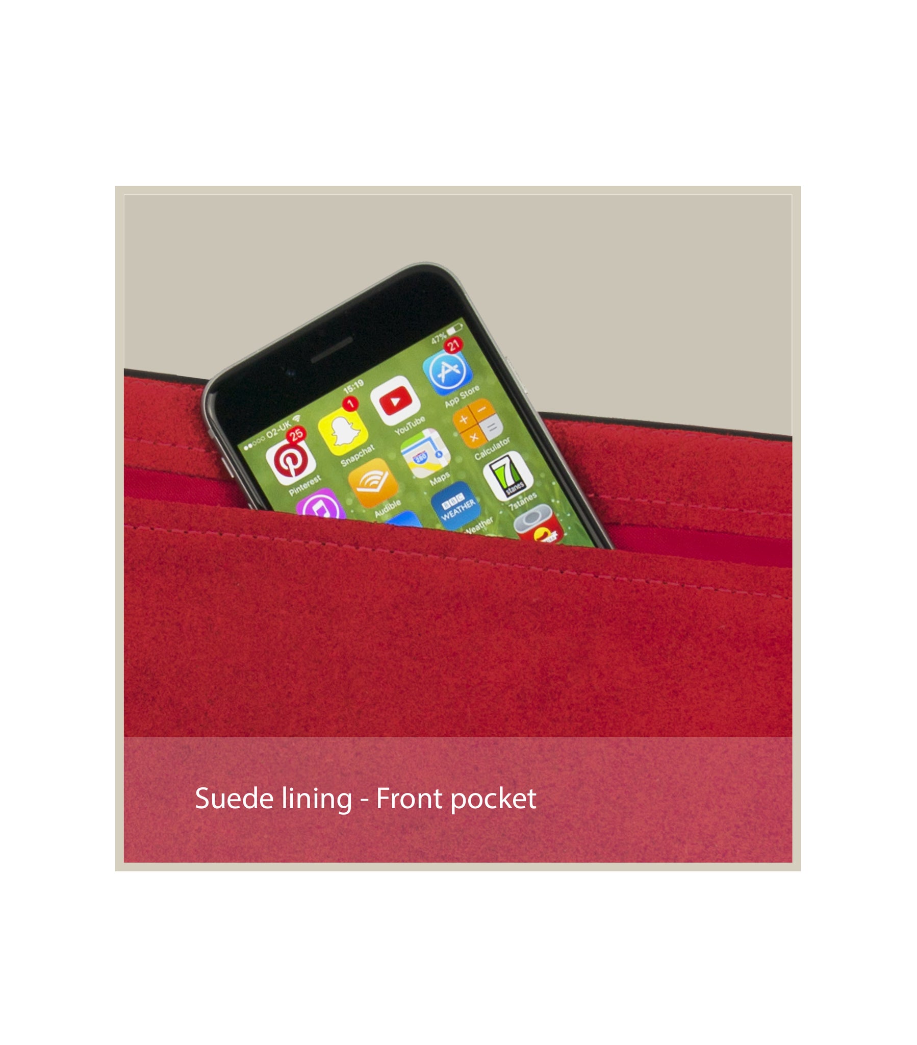 The inner lining is suede, in a complimentary red colour, which looks fabulous when the bag is open, and you can view the tartan and suede together. With your keys and makeup in the main body of the bag, and a separate zip pocket at the back for money and valuables, your mobile phone will be safe and secure in the full-width front pocket.